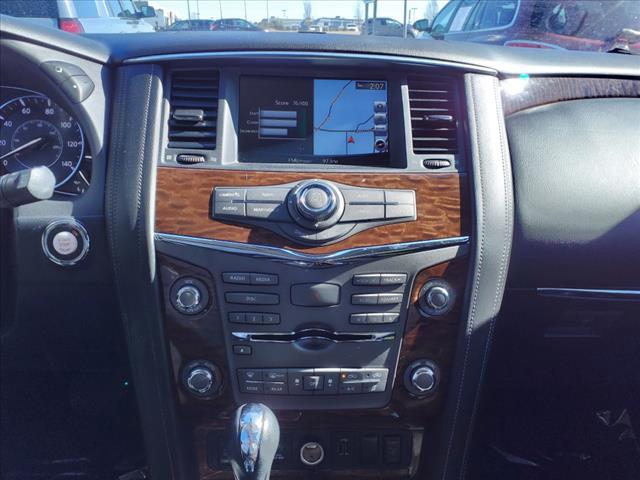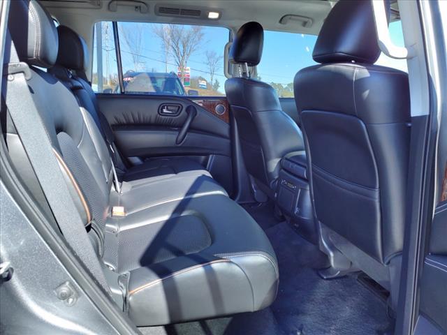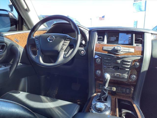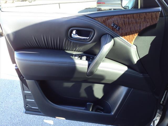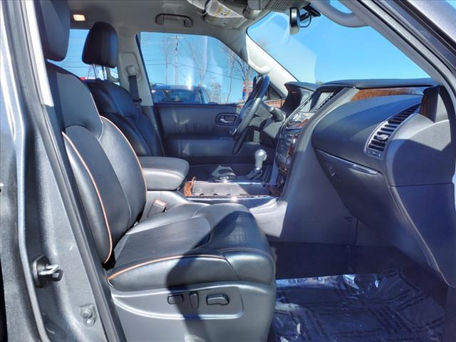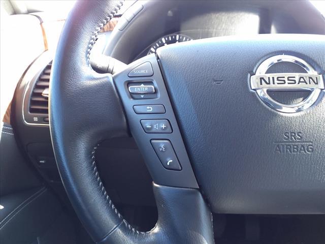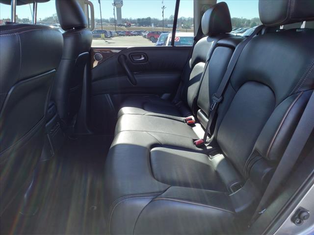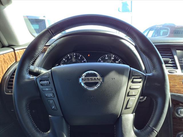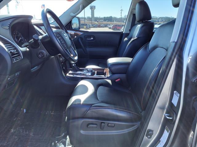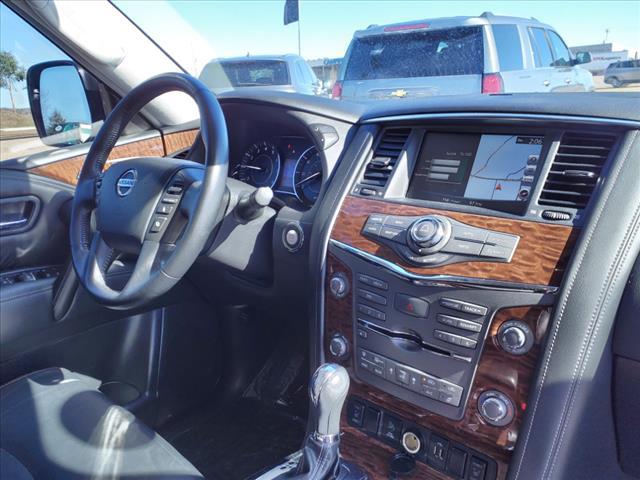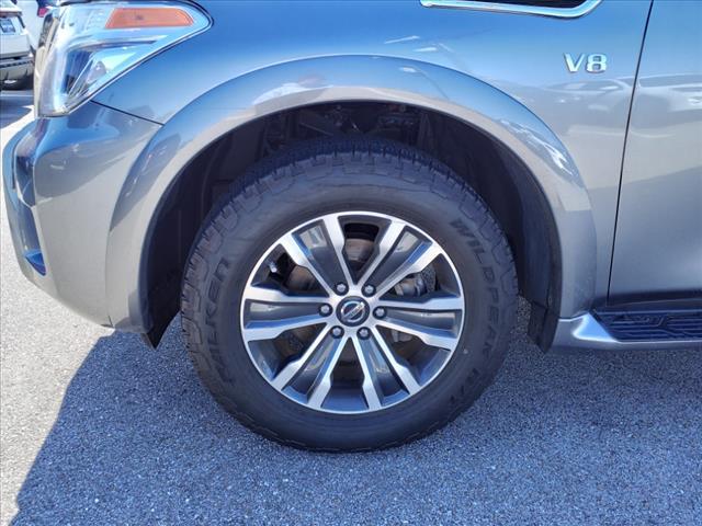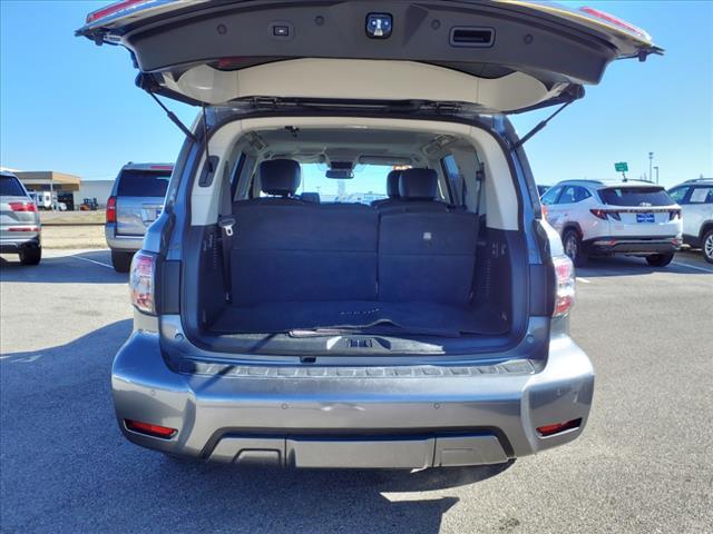Clean CARFAX. Gun Metallic 2020 Nissan Armada SL 4WD 7-Speed Automatic 5.6L V8Homer Skelton is committed to meeting your automotive needs with speed flexibility and friendly customer service. Odometer is 16456 miles below market average!Premium Package (Blind Spot Warning Intelligent Back-Up Intervention (I-BI) Intelligent Distance Control (I-DC) Power Sliding Moonroof w/Front Tilt & Rear Slide and Rear Cross Traffic Alert (RCTA)) 4WD 20"" Painted Alloy Wheels Navigation System 13 Speakers 3rd Row Carpeted Floor Mats - Bench Seat 3rd row seats: split-bench 4-Wheel Disc Brakes ABS brakes Air Conditioning Alloy wheels AM/FM radio: SiriusXM Anti-whiplash front head restraints Auto tilt-away steering wheel Auto-dimming door mirrors Auto-dimming Rear-View mirror Auto-leveling suspension Automatic temperature control Axle Ratio: 2.94 Brake assist Bumpers: body-color CD player Delay-off headlights Driver door bin Driver vanity mirror Dual front impact airbags Dual front side impact airbags DVD-Audio Electronic Stability Control Emergency communication system: NissanConnect Services Four wheel independent suspension Front anti-roll bar Front Bucket Seats Front Center Armrest Front dual zone A/C Front fog lights Front reading lights Fully automatic headlights Garage door transmitter: HomeLink Heated door mirrors Heated Front Bucket Seats w/Power Driver's Memory Heated front seats Illuminated entry Leather Shift Knob Leather-Appointed Seat Trim Low tire pressure warning Memory seat Occupant sensing airbag Outside temperature display Overhead airbag Overhead console Panic alarm Passenger door bin Passenger vanity mirror Power door mirrors Power driver seat Power Liftgate Power passenger seat Power steering Power windows Radio data system Radio: AM/FM/SXM/CD/MP3/HD Rain sensing wipers Rear air conditioning Rear anti-roll bar Rear reading lights Rear seat center armrest Rear window defroster Rear window wiper Reclining 3rd row seat Remote keyless entry Roof rack: rails only Security system Speed control Speed-sensing steering Speed-Sensitive Wipers Split folding rear seat Spoiler Steering wheel memory Steering wheel mounted audio controls Tachometer Telescoping steering wheel Tilt steering wheel Traction control Trip computer Turn signal indicator mirrors Variably intermittent wipers and Voltmeter.